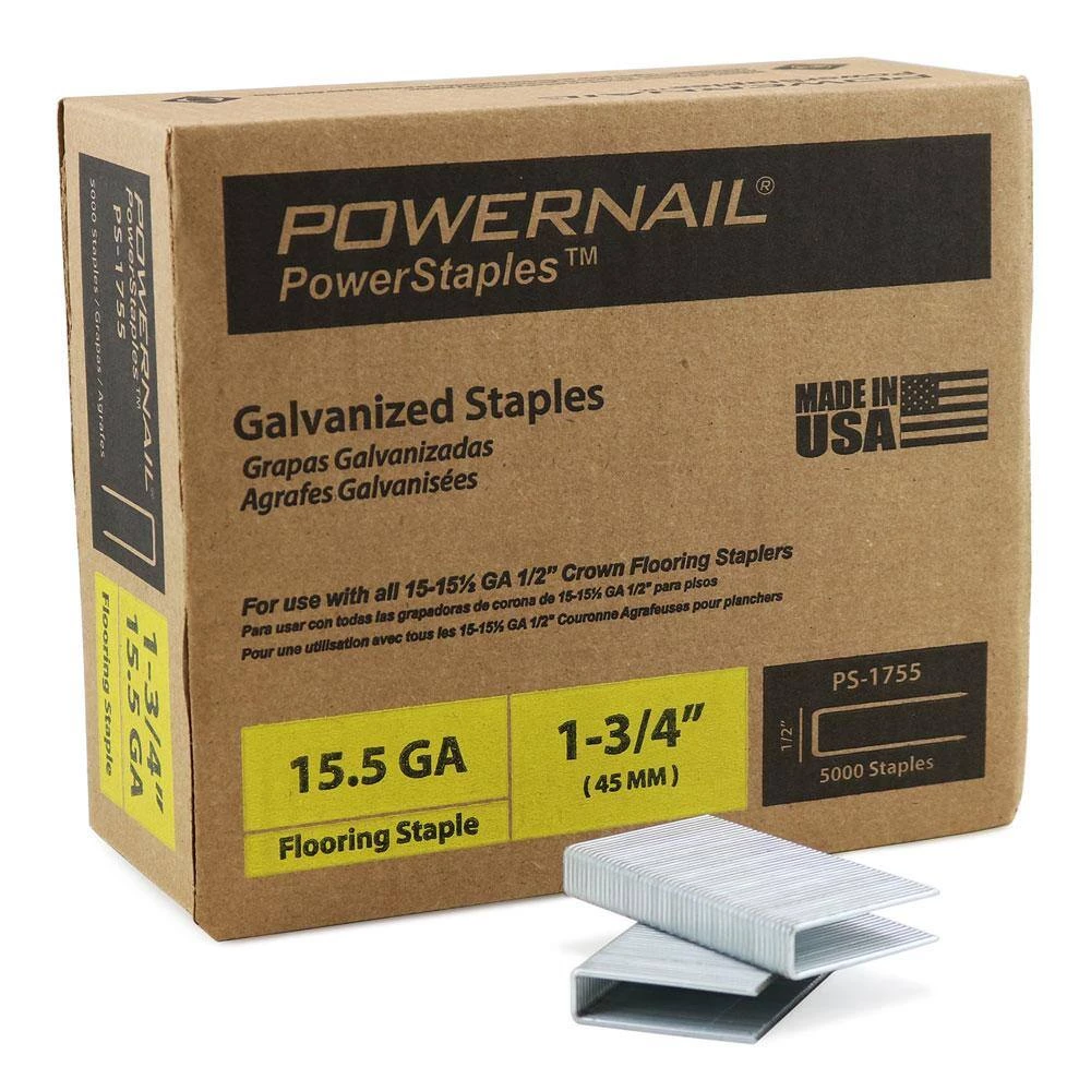POWERNAILs PowerStaples are the flooring industry’s premium grade of Flooring Staples. Made of Cold-Rolled Steel and featuring incredibly sharp Chisel points, these staples will drive through the hardest species of hardwood flooring. These wood flooring staples can be used in any flooring stapler that calls for a 15-Gauge or 15.5-Gauge staple. Sold per Case of 5000, these staples are perfect for the Pro or DIYer with large or multiple projects.