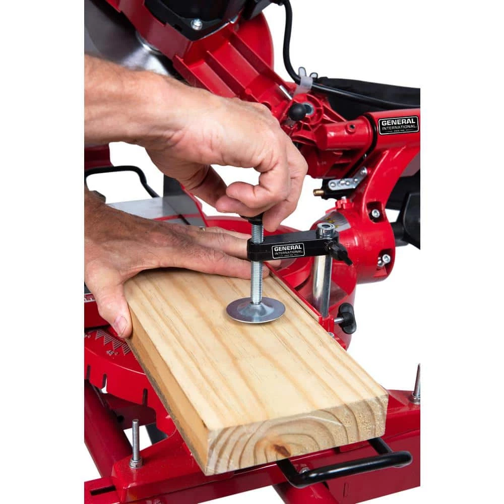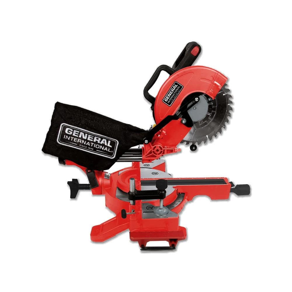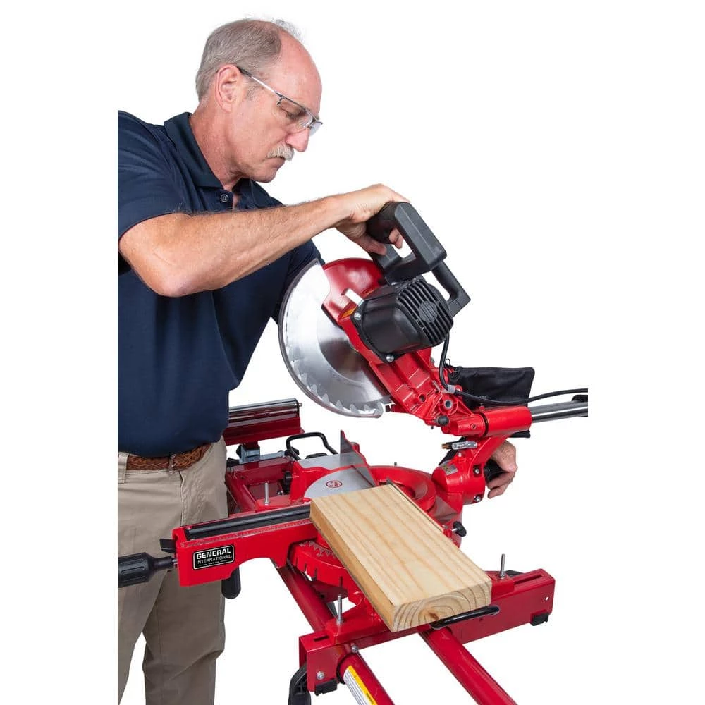 Make custom cuts with the General International 10 in. Sliding Miter Saw. This saw boasts dual slide rails for rigidity and precision cuts using the built in laser alignment system. This saw also has a no-load speed of 4,400 RPM, a comfortable horizontal D-Handle and can perform Bevel cuts up to 45° left.