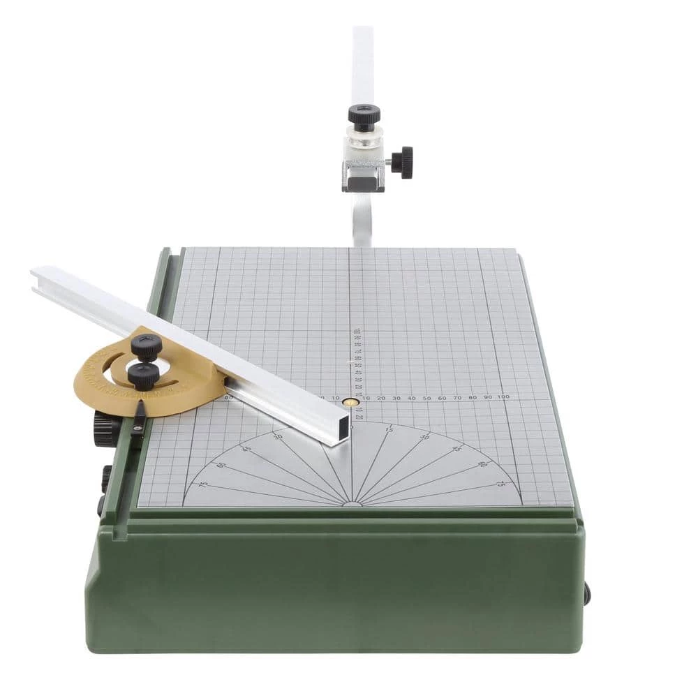 Ideal for architects, designers, decorators, artists and teachers. For building architectural models, prototypes as well as classic model railroad, plane and boat items. The large table with (15) 11/32 in. x 11 in. (390 x 280 mm) ensures smooth and easy movement of the work piece. The printed grid and protractor assist with division and cutting. The solid aluminum overarm has a 13 3/4 in. (350 mm) throat and offers 5 1/2 in. (140 mm) in height. The holder and wire coil (one spool of wire 98 ft., 0.008 in. Dia is included) may be shifted and adjusted along the overarm to enable miter cutting. An LED indicates operation and thus reminds you not to touch the hot wire to prevent burnt fingers (the wire heats to maximum in less than 1 second). Technical data: Cutting wire temperature 210-390F (100-200C) 10-Volt At 1 A, 110-120-Volt AC, 60 Hz. Weight 6.6 lbs.