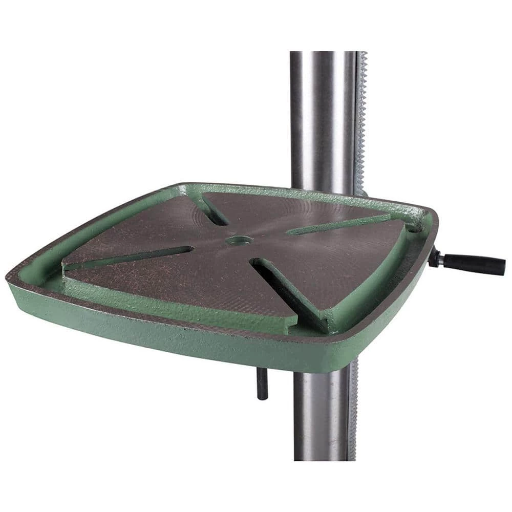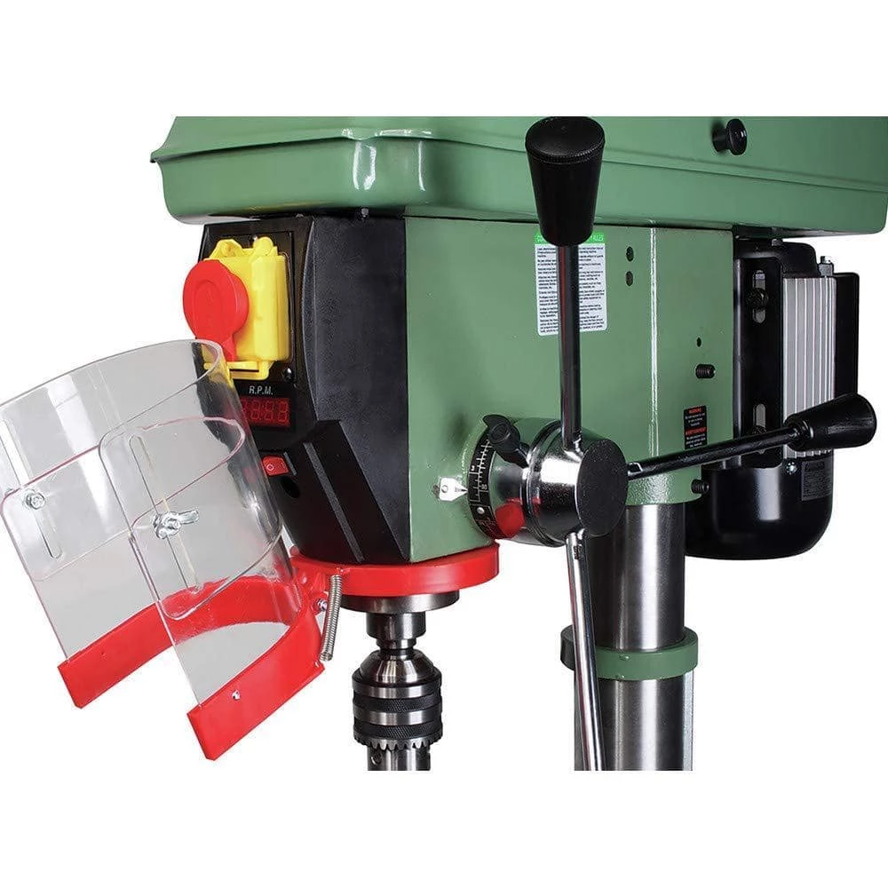 General International specializes in high quality woodworking and metal working machinery. The 17 in. Drill Press features an adjustable spindle tension return spring, built-in laser pointer, sturdy design with cast-iron head, base and table. With simple hand lever controlled mechanical variable speed (280 RPM to 2100 RPM) and Digital spindle speed display. High-quality bearings for smooth, vibration-free operation. The drill is fitted with a 3/4 HP industrial-quality 120-Volt motor (6 Amp). Equipped with easy-to-adjust dual depth stop for complete control of both down stroke depth and upstroke travel. 5/8 in. chuck with key and convenient on-board chuck key holder. Easy-to-use see-through flip-up chuck guard included. Crank-operated rack and pinion table height adjustment. Forced opening line interrupter switch, requires machine restart in case of power failure or circuit interruption. Covered by a 2-year Limited Warranty.