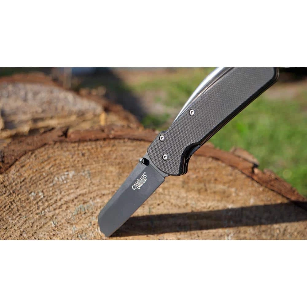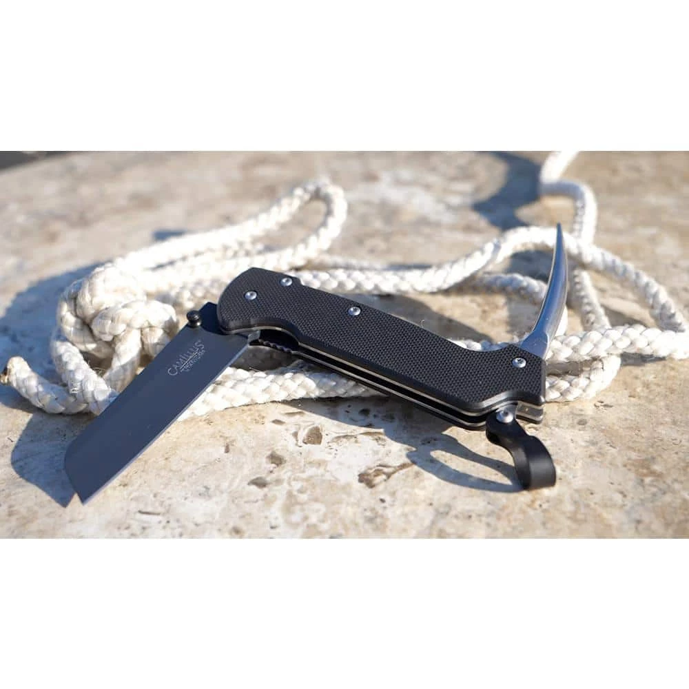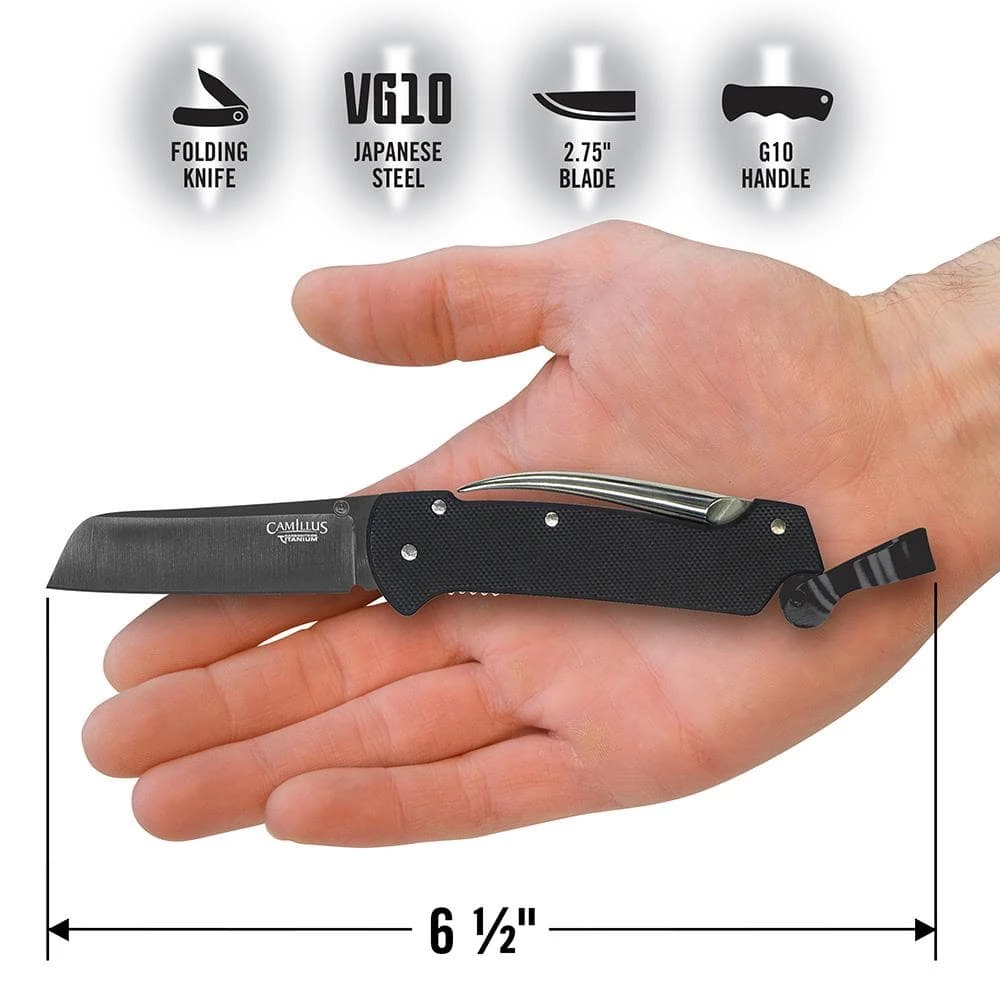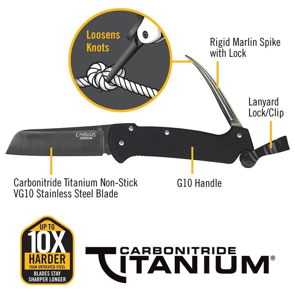 The Camillus 6.5 in. Folding Knife with Marlin Spike features a G10 Handle and VG10 Steel. VG10 is considered a super steel, because it is designed to maintain sharpness and durability. The steel is bonded with Carbonitride Titanium that resists rust and corrosion and is up to 10X harder than untreated steel so the blades stay sharper, longer. Dual locking system. The Marlin Spike can be locked into place. This tool is used to help loosen knots. In addition it can be used for unlaying rope and untying knots. Knife Blade is 2.5 in. Lifetime warranty.