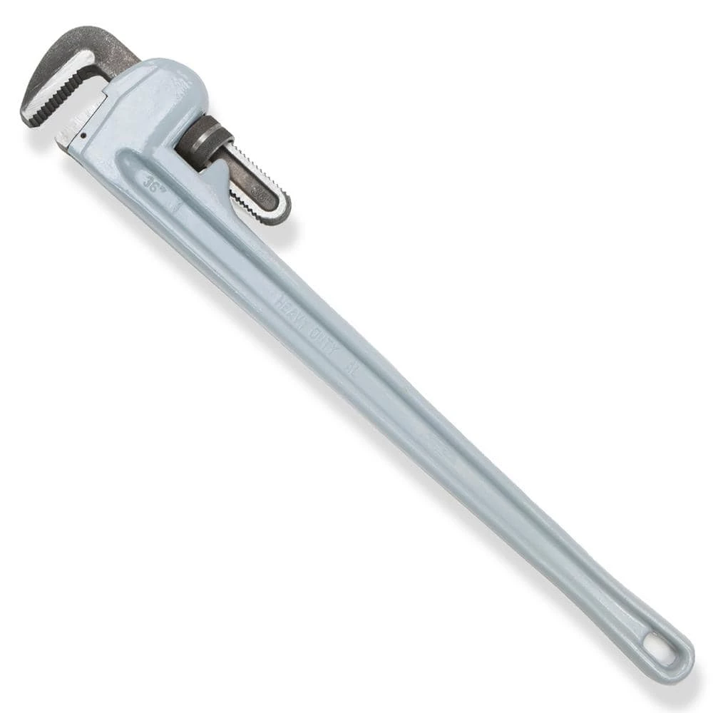 This Stark 36 in. Aluminum Pipe Wrench is a straight pipe wrench with hardened jaw teeth and adjustable nuts to accommodate the needs of both professionals and serious DIY handymen. The pipe wrench is designed for gripping and turning of threaded pipes, clamped pipes and other pipe fittings. Made with a lightweight aluminum alloy handle for reduced working strength and fatigue of users. The plumbers wrench is constructed with hardened jaws and nuts that underwent drop-forging and heat treatment to offer long-lasting durability and rigid strength. Precisely CNC machined to have serrated jaw teeth that makes it have superior grip strength to secure pipes against fair amount of resistance. The lightweight, durable aluminum pipe wrench makes it an easy task to perform on a variety of plumber repair needs.