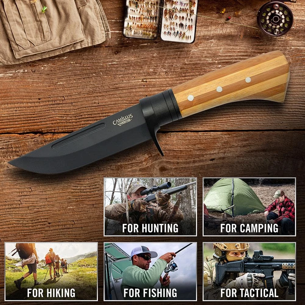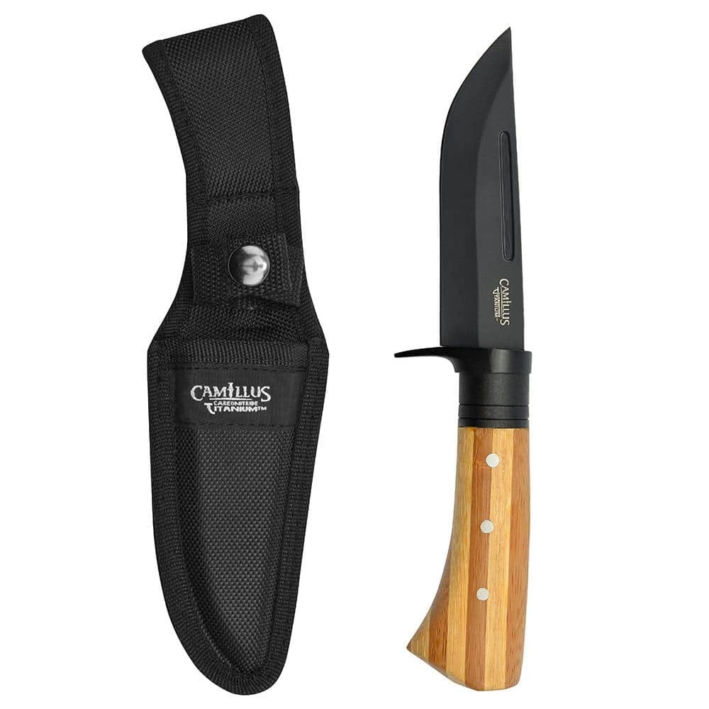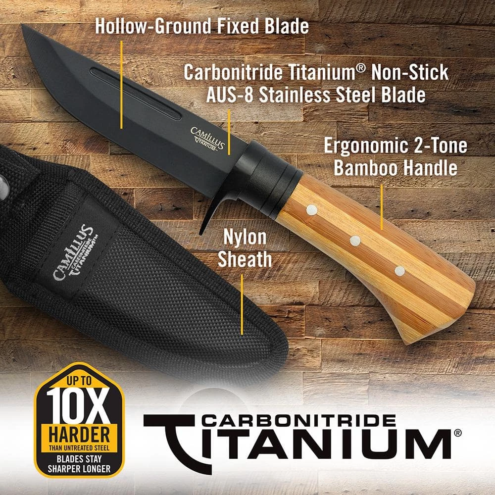 Camillus 9.75 in. Fixed Blade Knife with 2-Tone Bamboo Handle and AUS-8 Japanese Steel Blade. Steel is bonded with Carbonitride Titanium that resists rust and corrosion and is up to 10X harder than untreated steel so the blade stays sharper, longer. Hollow ground fixed blade. Ergonomic, Eco-friendly 2-tone Bamboo handle. Includes ballistic nylon sheath. Lifetime Warranty.