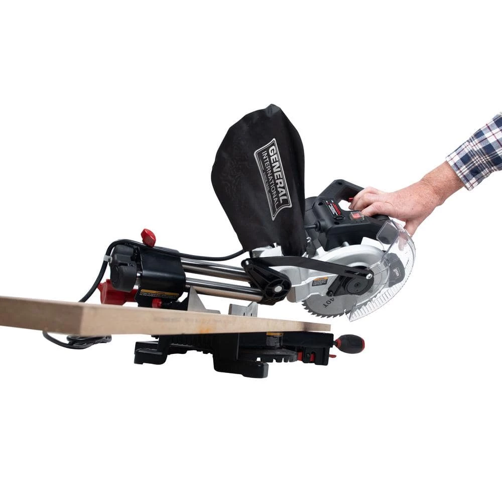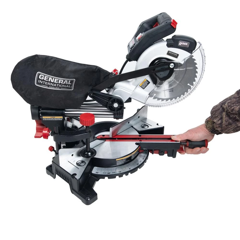 The General International 10 Amp 7.25 in. Compound Miter saw packs a punch, with a 5000 RPM blade speed and miter range of 0° to 45°. with table extension side bars, table clamp and rear stabilization bars for precision cuts, the MS3002 out performs other saws. This MS3003 miter saw has a dynamically balanced 10 Amp direct-drive motor with 5000 rpm for improved performance and is engineered to never slip or bog down like belt-drive units. The electronic speed control maintains constant speed under load and the soft-start technology is engineered for smooth start-ups. General Miter saw has a dual post compound pivot arm with bevel cuts up to 45° to the left. Miter adjustments range from 0° to 45° left and 0 to 52° right, with 9 positive miter stops at 15°, 22.5°, 30° and 45° (left or right) and 0° (90° cuts). The engineered aluminum base ensures accurate cuts. Ease-of-use and comfort features include a laser light that works independently of the blade rotation to clearly illuminate the work surface and a compact size (weighs only 21 lbs.) for easy portability. This MS3002 is engineered for a broad range of trades, including finish carpenters, professional woodworkers, case and base installers, cabinet installers, decking and flooring applications, siding installers and general contractors seeking a superior 10 in. compound miter saw for the jobsite or the benchtop.