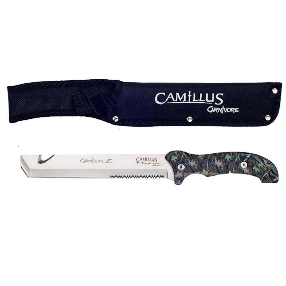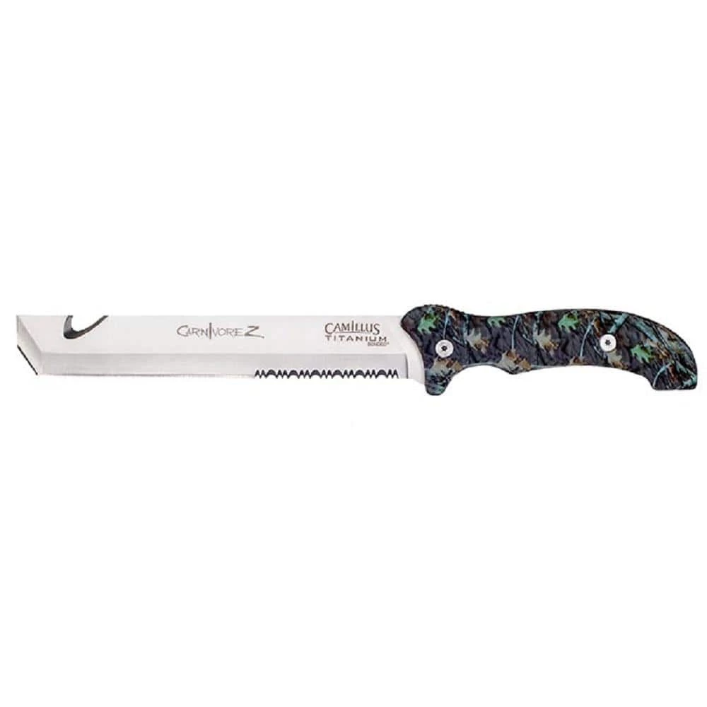 Camillus 13 in. Titanium Bonded Carnivore Z Machete with a 8 in. Full Tang Stainless Steel Blade. Steel is Titanium Bonded which helps it to resist rust and corrosion plus, it is up to 3X harder than untreated steel so the blade stays sharper, longer. Rugged ABS Handle, Multi-Grind 8 in. Blade with Chisel, Cutting, Sawing and Wire Cutter Capabilities. Includes Ballistic Nylon Sheath. Lifetime Warranty.