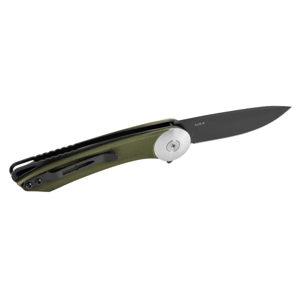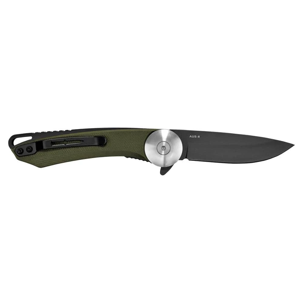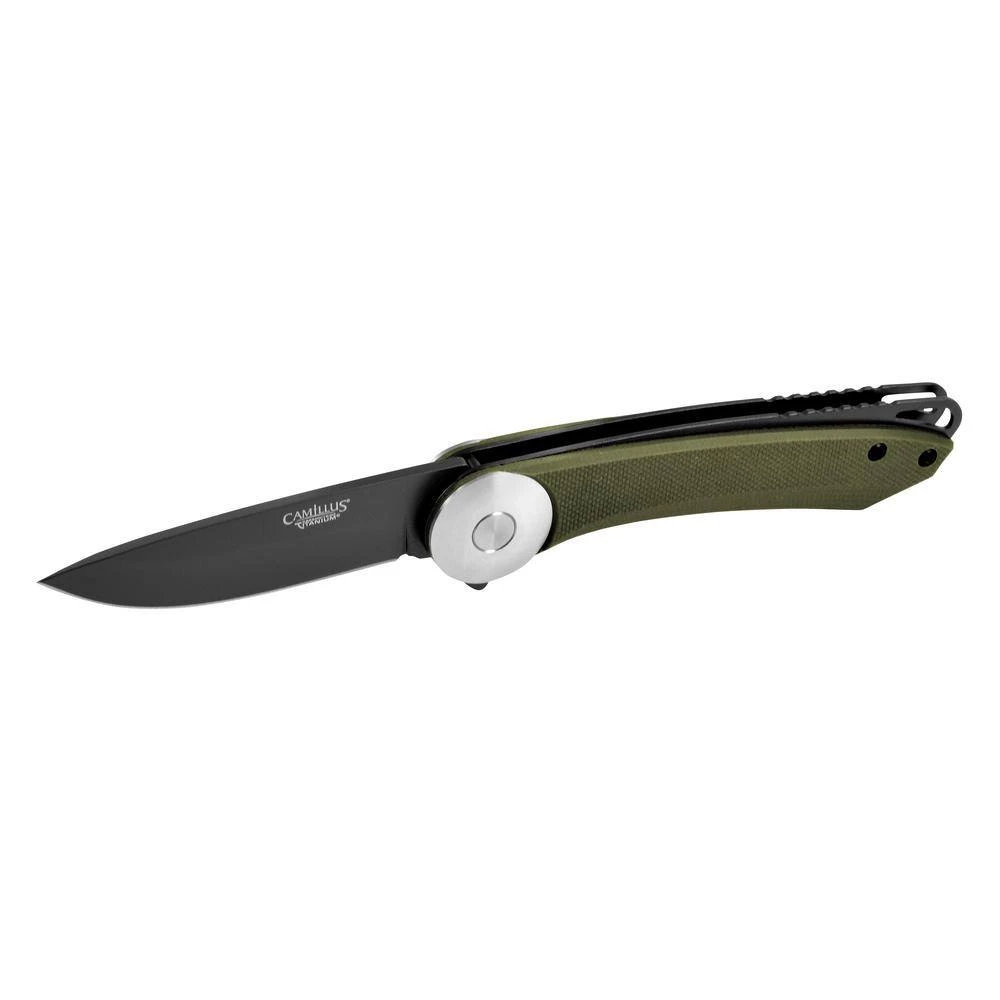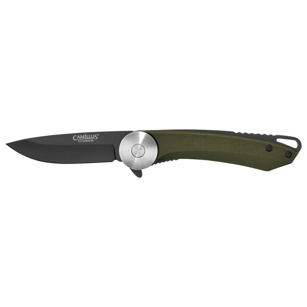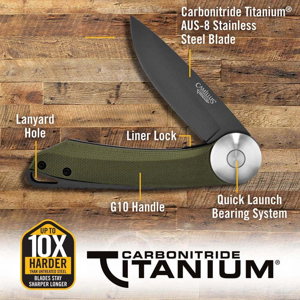 Camillus Cirque 7 in. Folding Knife with a G10 handle and AUS-8 Steel Blade. G10 handles are impervious to moisture or liquid and physically stable under climate change. AUS-8 offers exceptional balance between toughness, edge sharpness, and corrosion resistance. The steel is bonded with Carbonitride Titanium that resists rust and corrosion and is up to 10 x harder than untreated steel, so the blade stays sharper, longer. 2.75 in. Drop Point Blade. Lifetime Warranty.