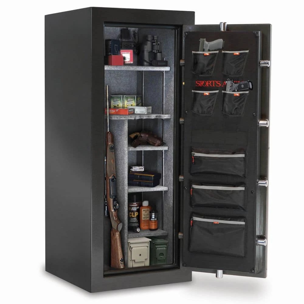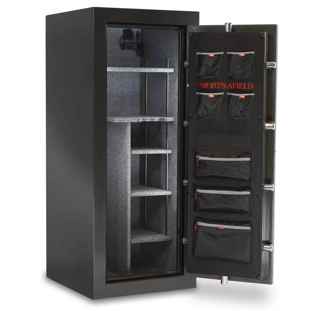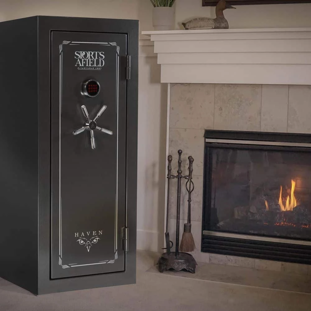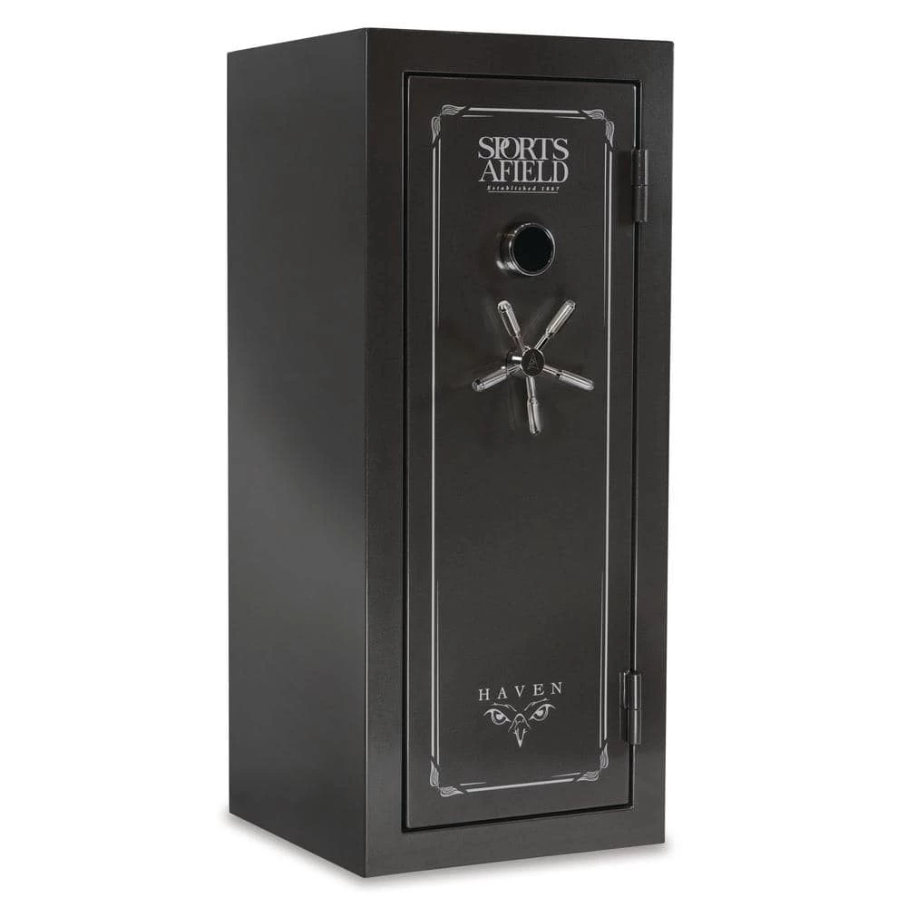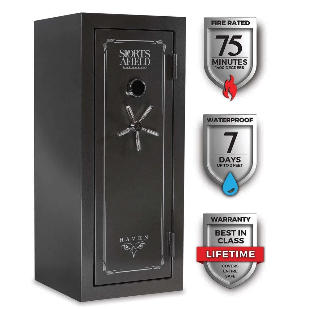 The Sports Afield Haven 24-Gun Fire/Waterproof Gun Safe is intelligently designed to keep your firearms and valuables away from theft, fire, and natural flood. Our Triple Seal fire, water, and smoke protection combined with a full-seam Uni-Weld body construction, ten 1.5 in. solid steel locking bolts, pre-drilled bottom bolt-down holes, and electronic lock create a fortified barrier for protection. The illuminated electronic lock features Print Guard technology which cleverly disguises your passcode. Print Guard technology generates a random 2-digit sequence prior to you entering your passcode to ensure a random pattern of fingerprints across the lock face to deter pattern-guessing thieves. The convertible interior is fully carpeted with bright interior lighting, adjustable/removable top shelf and side shelves, and a deluxe pocket door organizer. This long gun safe has 24 barrel rest positions and 4 handgun holsters. Backed by our industry’s best-in-class Lifetime Warranty that covers your entire safe against theft, fire, natural flood, and defective locks, parts, and paint with free shipping on replacement safes and locksmith services if you ever get locked out.
