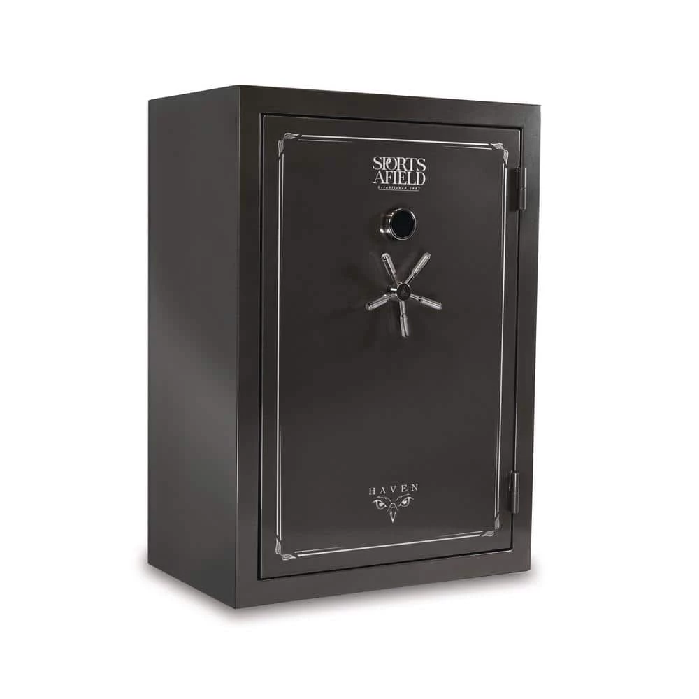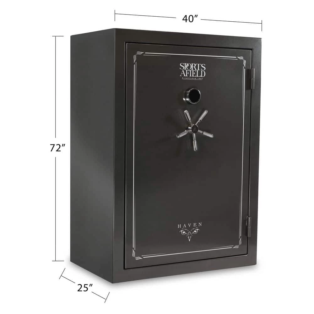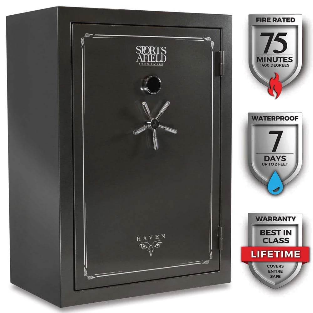 The Sports Afield Haven 48-Gun Fire/Waterproof Gun Safe is intelligently designed to keep your firearms and valuables away from theft, fire, and natural flood. Our Triple Seal fire, water, and smoke protection combined with a full-seam Uni-Weld body construction, ten 1.5 in. solid steel locking bolts, pre-drilled bottom bolt-down holes, and electronic lock create a fortified barrier for protection. The illuminated electronic lock features Print Guard technology which cleverly disguises your passcode. Print Guard technology generates a random 2-digit sequence prior to you entering your passcode to ensure a random pattern of fingerprints across the lock face to deter pattern-guessing thieves. The convertible interior is fully carpeted with bright interior lighting, adjustable/removable top shelf and side shelves, and a deluxe pocket door organizer. This long gun safe has 48 barrel rest positions and 8 handgun holsters. Backed by our industry’s best-in-class Lifetime Warranty that covers your entire long gun safe against theft, fire, natural flood, and defective locks, parts, and paint with free shipping on replacement safes and locksmith services if you ever get locked out.