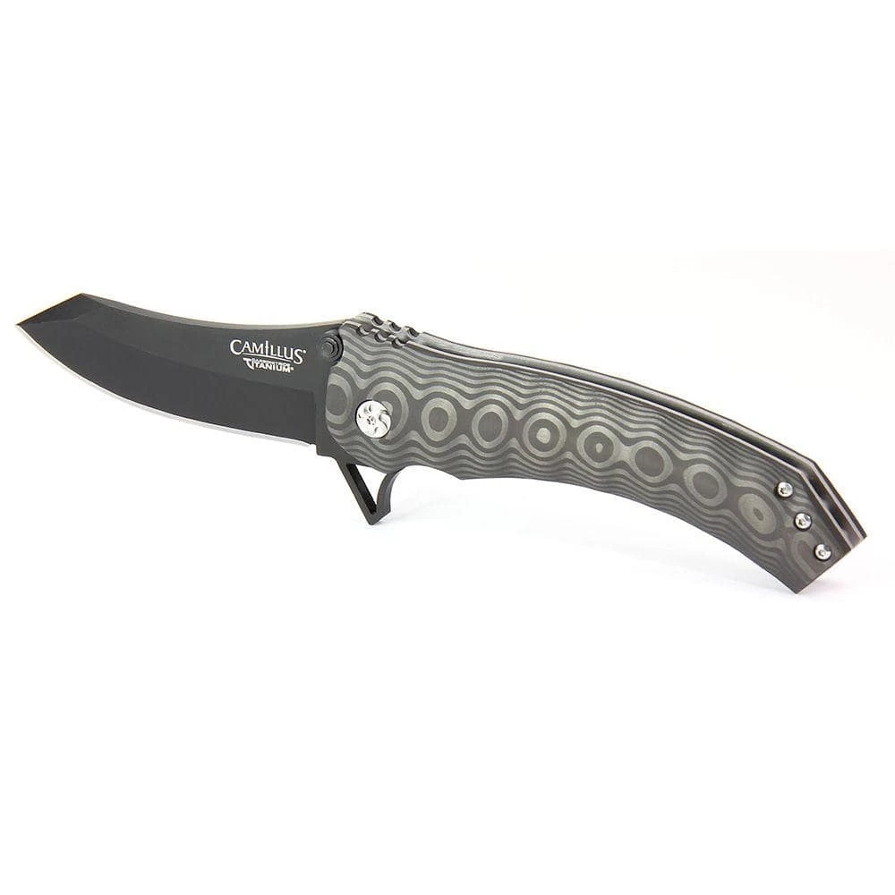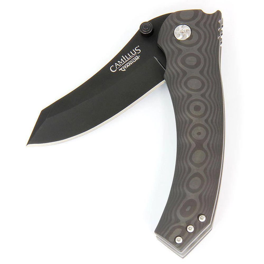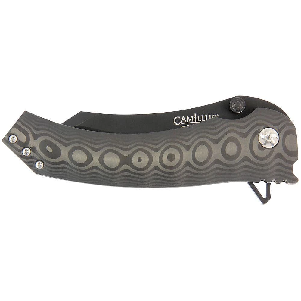 The Camillus Jolt folding knife features a carbonitride titanium non-stick blade, 3.25 in. D2 steel blade, hollow ground, custom carbon fiber handles, liner lock and a dual Since 1876, Camillus cutlery has been supplying the world with reliable, innovative and quality made knives that have survived the true test of time. As 1 of the oldest knife manufacturers, Camillus cutlery has always answered the call for quality and will continue to do so with hunting, fishing, sporting and tactical knives. An 8.5 in. carbonitride titanium folding knife with a 3.25 in. D2 steel blade. The Jolt had custom carbon fiber handles and a dual thumbstud opener.