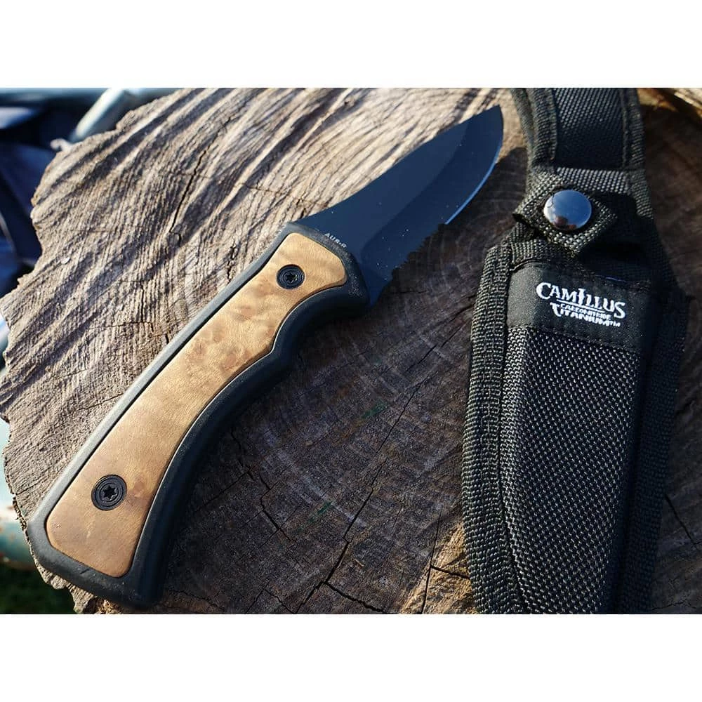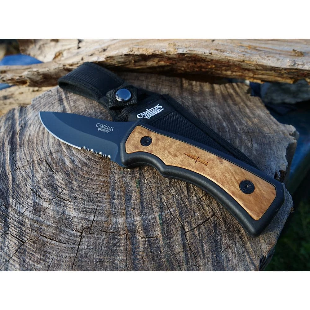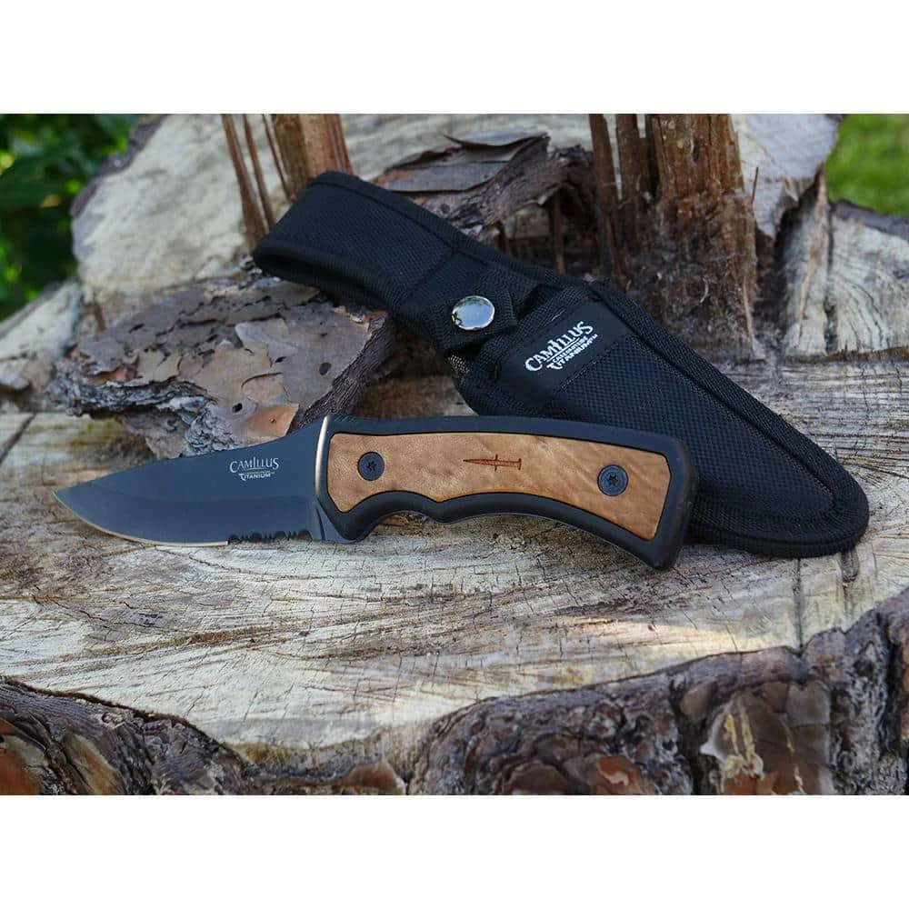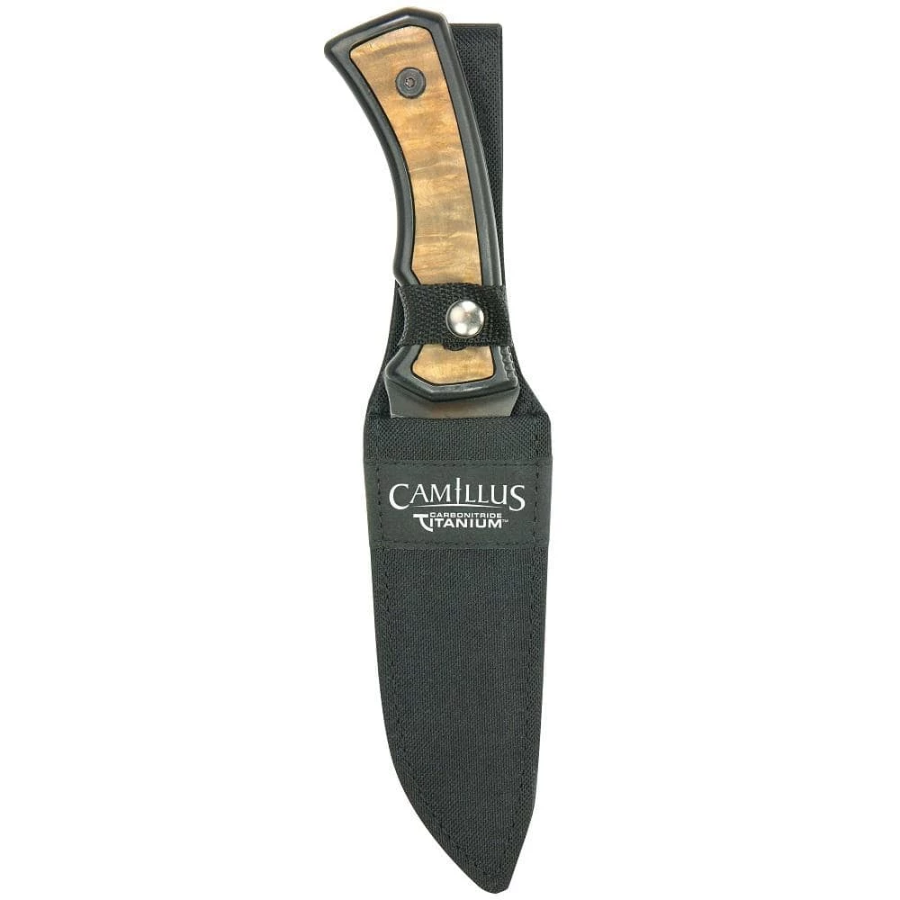 Camillus MOUNTAINEER 9 in. Fixed Blade Knife with Ballistic Nylon Sheath and 4 in. AUS-8 Steel Blade. Steel is bonded with Carbonitride Titanium that resists rust and corrosion and is up to 10X harder than untreated steel so the blade stays sharper, longer. Thermoplastic rubber with Burlwood inserts combine comfort with beauty. Lifetime Warranty.