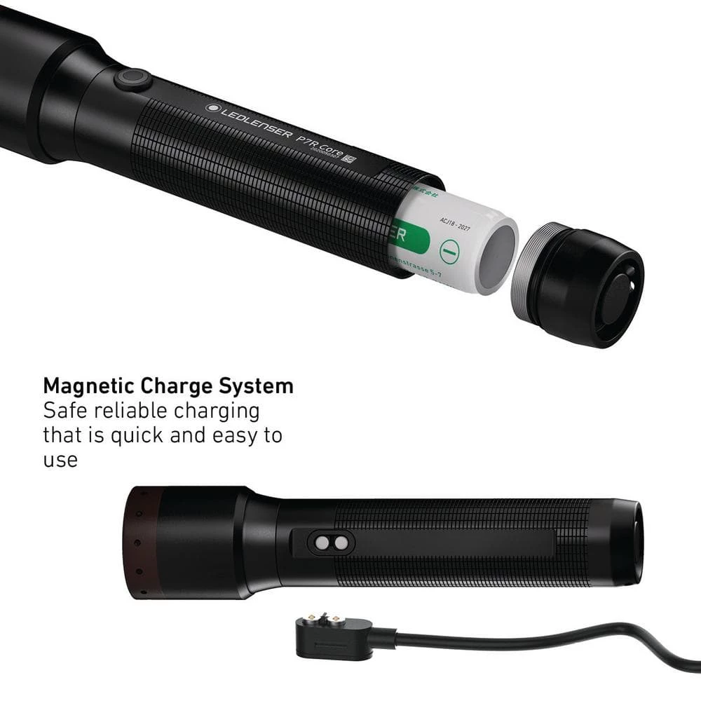 The LEDLENSER P7R Core is an all-new flashlight perfectly protected from dust and water. Its sleek design encases cutting-edge technology that provides bright views. The P7R Core is customizable with the innovative Smart Light Technology and can be charged with the Magnetic Charge System. It also has our patented Advanced Focus System combined with the new Multi-Core Optics Technology, which offers a consistent light beam in spot or flood mode and if necessary, even under water. And if you want to keep your hands free and illuminate a room, the lamp can easily be placed on the end cap.