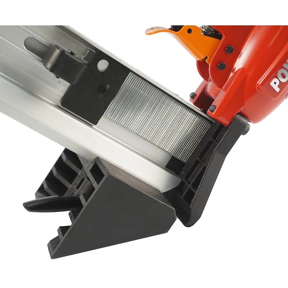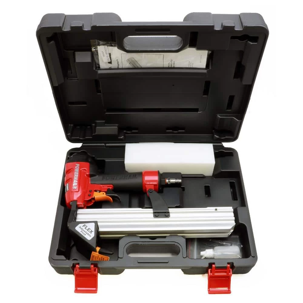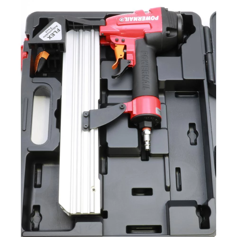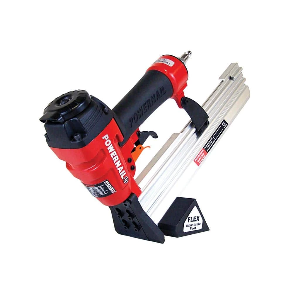 The Model 1845F Floor Stapler by POWERNAIL is designed with performance in mind and is the ideal solution for fastening today’s top Engineered and Laminate flooring. The 1845F features POWERNAIL re-designed FLEX Foot and only requires a simple adjustment to match varying wood thicknesses. The FLEX Foot can also slide off the tool, allowing you to top nail close to the wall. The 1845Fs unique nose design fits tightly into the nail pocket and slides securely along the plank for superior control. The nose design also features a clearing gate for the quick and easy removal of jammed staples. This tools compact size fits tight to walls, allowing for faster starts and finishes. The Model 1845F is the perfect installation tool for a wide variety of today’s top flooring.