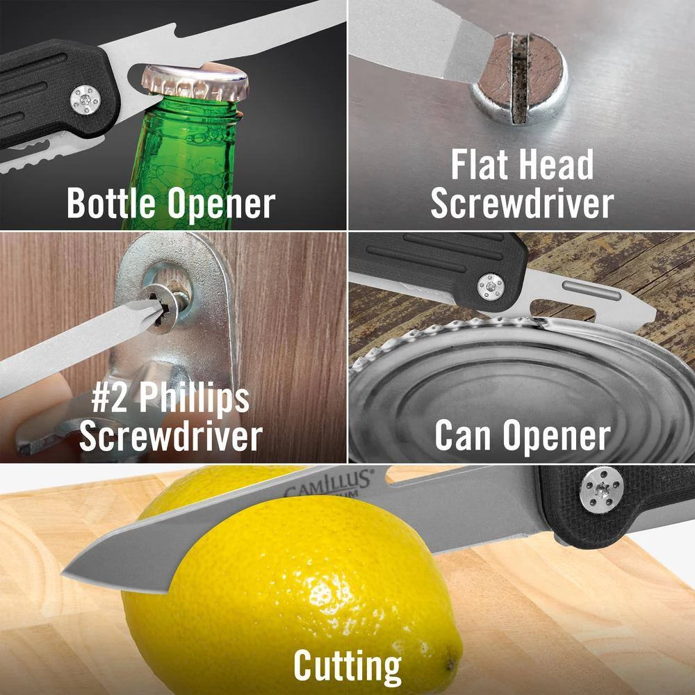 - Special feature: knife, bottle opener, flat head screwdriver, can opener and #2 Phillips screwdriver, this knife provides you with multiple functionalities and a great tool to have in your daily life