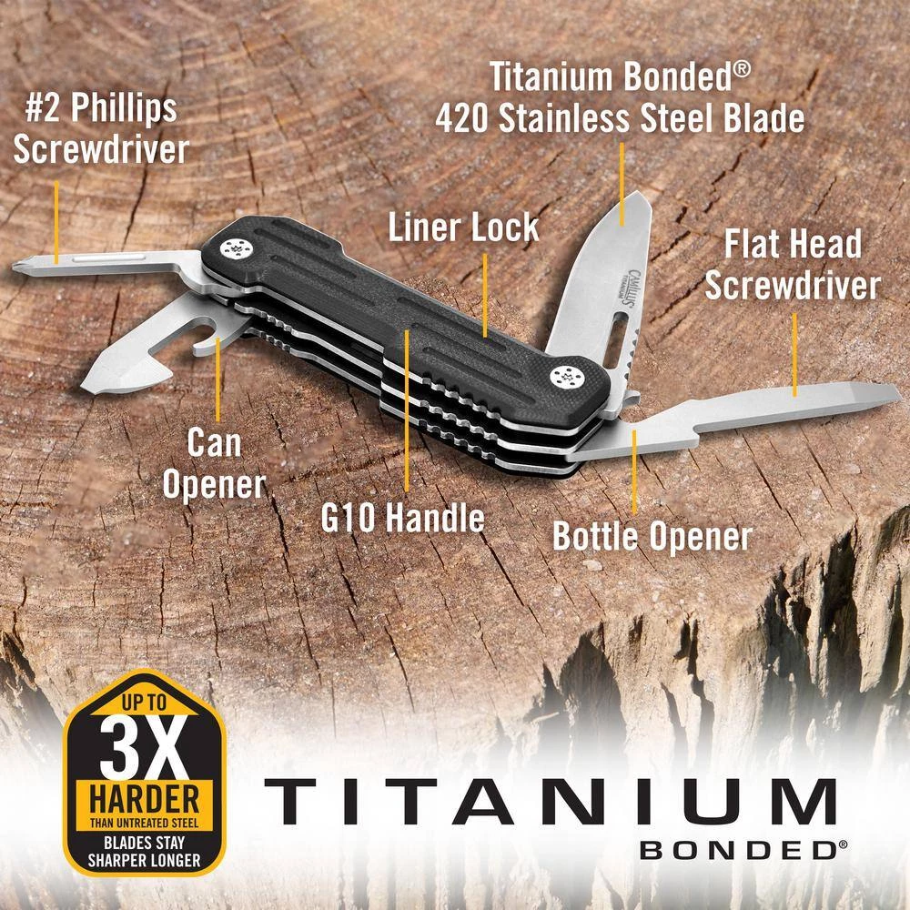 Camillus Pocket Block Folding Knife features hard, strong 420 steel with decent edge holding capabilities and fairly easy to sharpen, this steel is a good balance of the most desirable traits for knife steel. The handle made of G10 which is an extremely durable makeup of layers of fiberglass soaked in resin, then highly compressed or baked. It is impervious to moisture or liquid and physically stable under climate change. The Pocket Block features 5 Tools: Knife, Bottle Opener, Flat Head Screwdriver, Can Opener and #2 Phillips Screwdriver. This knife provides you with multiple functionality and is a must have for everyday use.