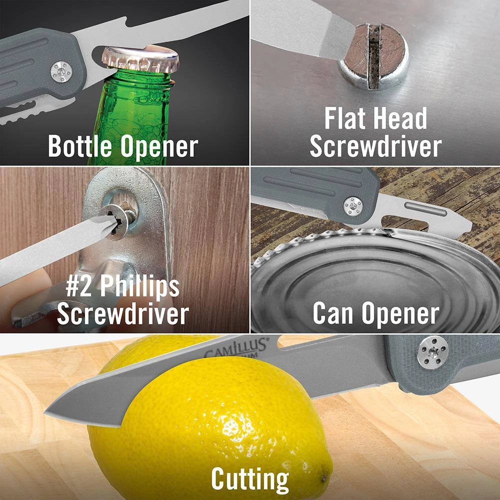 - Special feature: knife, bottle opener, flat head screwdriver, can opener and #2 Phillips screwdriver, this knife provides you with multiple functionalities and a great tool to have in your daily life