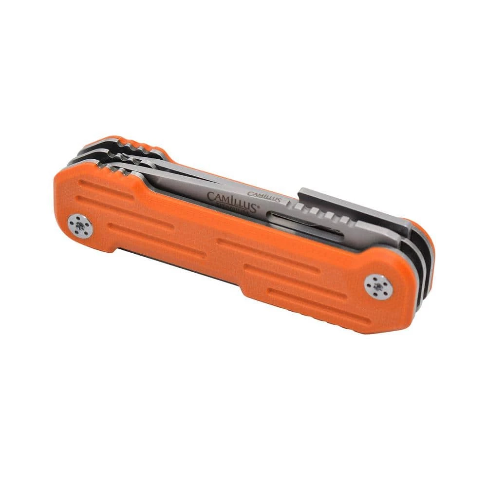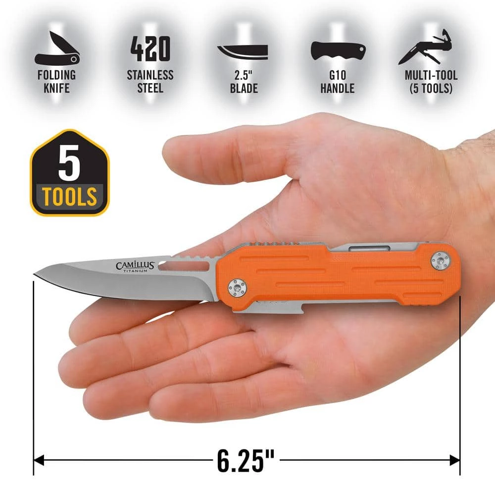 Camillus Pocket Block Folding Knife features hard, strong 420 steel with decent edge holding capabilities and fairly easy to sharpen, this steel is a good balance of the most desirable traits for knife steel. The handle made of G10 which is an extremely durable makeup of layers of fiberglass soaked in resin, then highly compressed or baked. It is impervious to moisture or liquid and physically stable under climate change. The Pocket Block features 5 Tools: Knife, Bottle Opener, Flat Head Screwdriver, Can Opener and #2 Phillips Screwdriver. This knife provides you with multiple functionality and is a must have for everyday use.