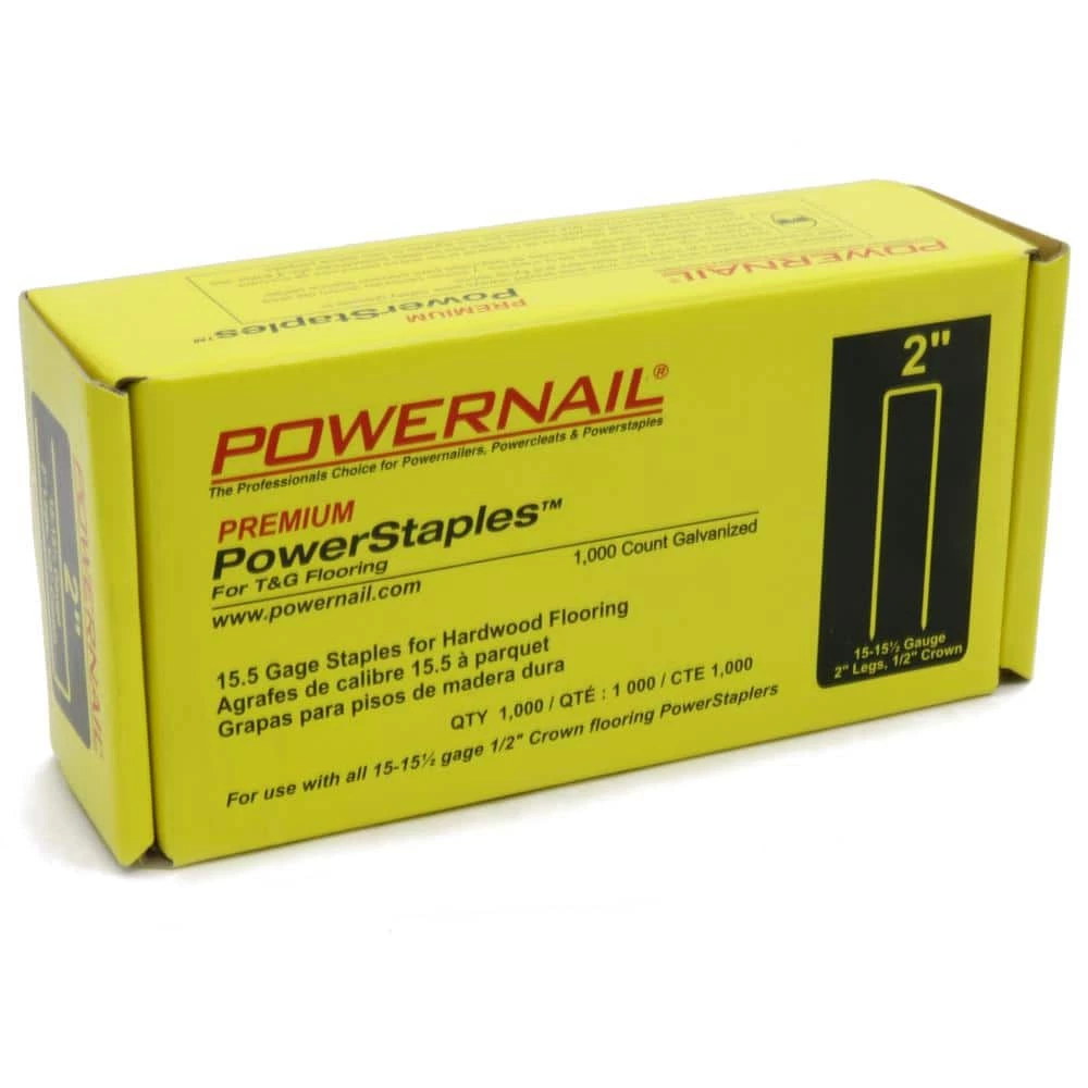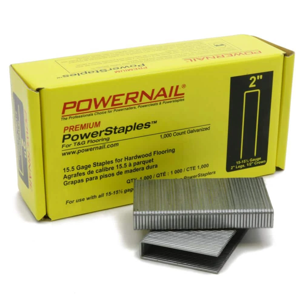 The POWERNAIL PowerStaples 2 in. Leg x 1/2 in. Crown x 15-1/2-Gauge Galvanized Steel Flooring Staples (1,000-Pack) are zinc coated for corrosion resistance. These staples can be used for tongue-and-groove flooring installations.