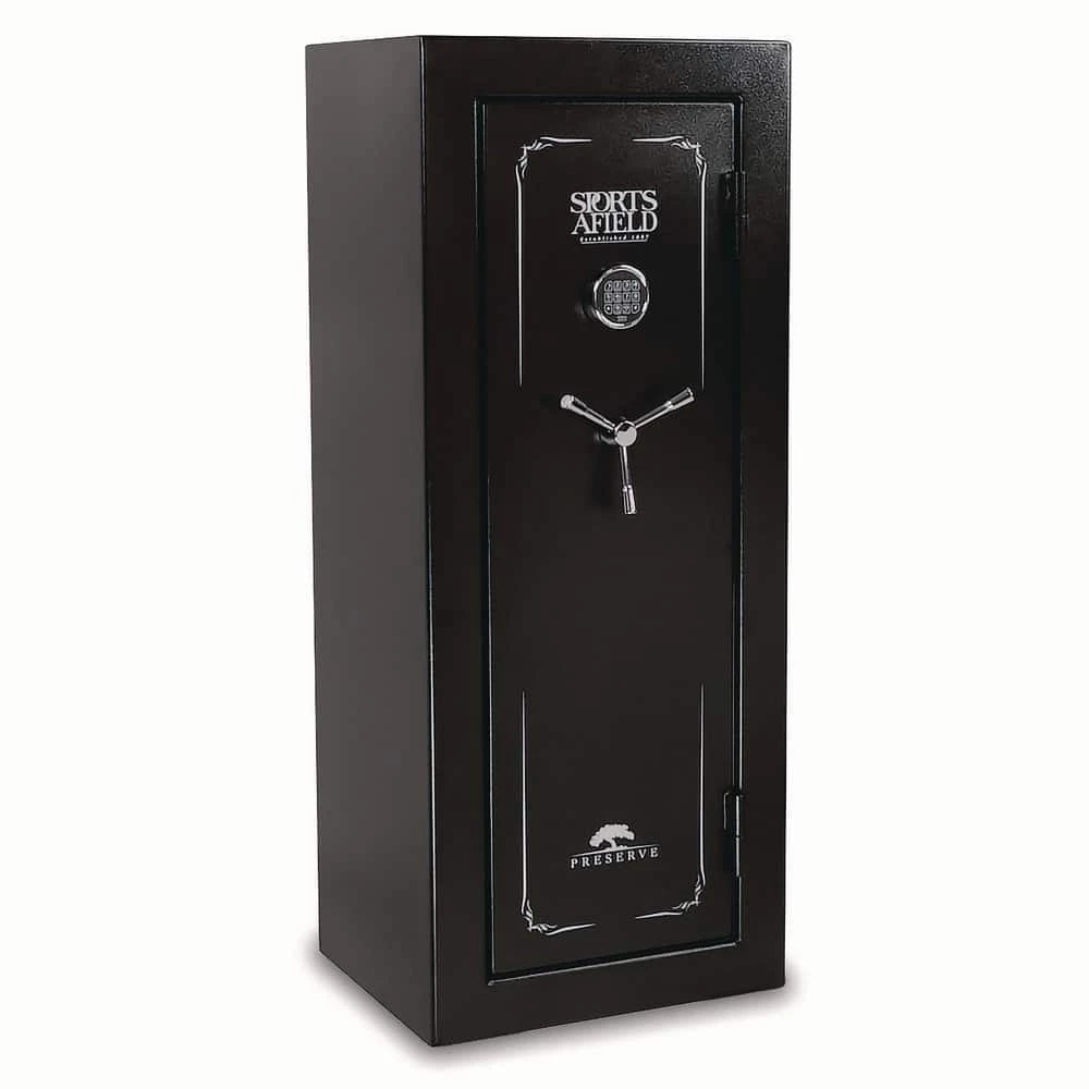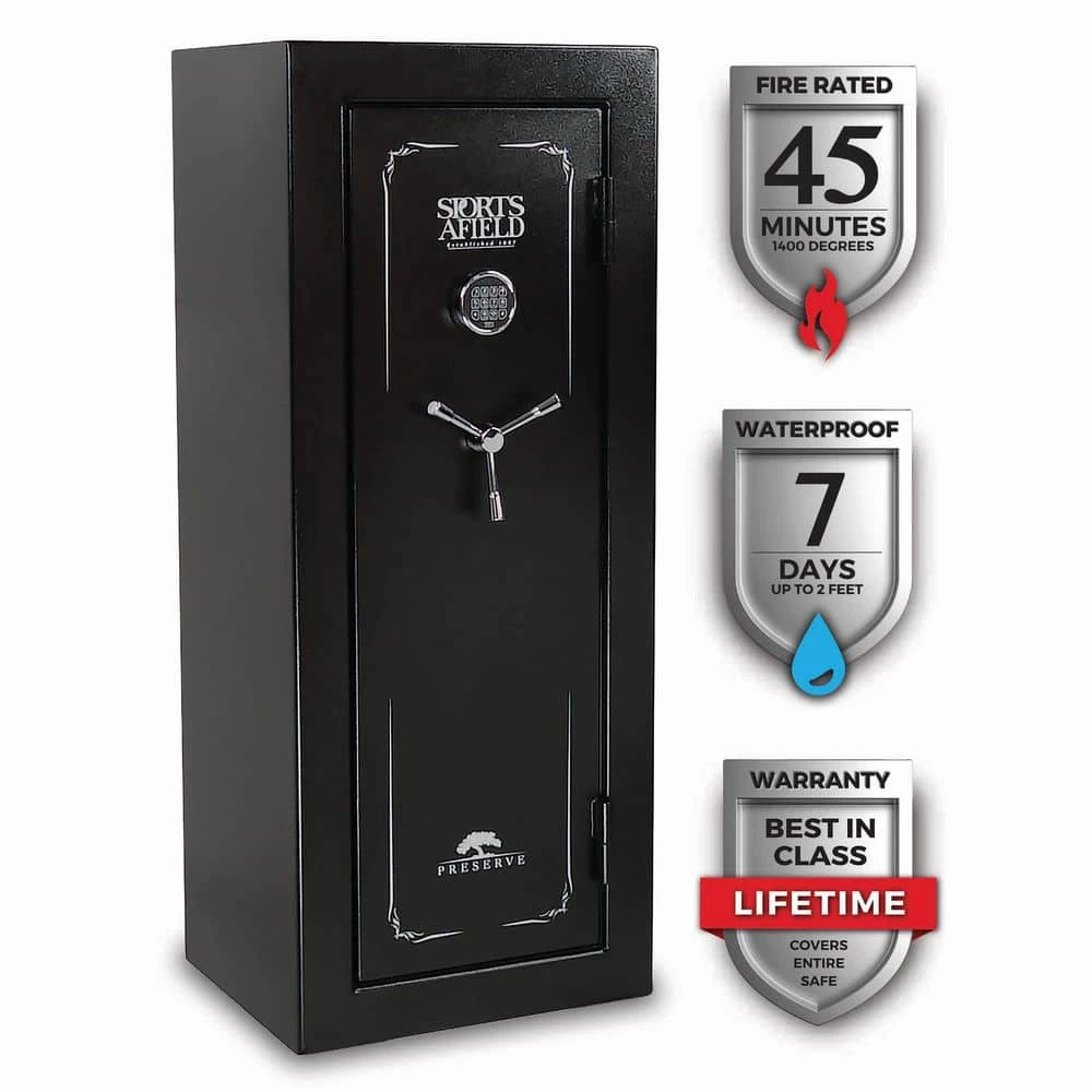 Store firearms with this Preserve 24-gun fire and waterproof safe. It accommodates up to 24 long guns and four handguns. A fully programmable electronic lock and an anti-theft alarm keep your items secure. For superior protection, it’s fire-rated for 45 minutes up to 1400 degrees F and water resistant for seven days in up to 2 ft. of standing water. Industrial grade steel with a fortified uni-weld body makes it built to last.