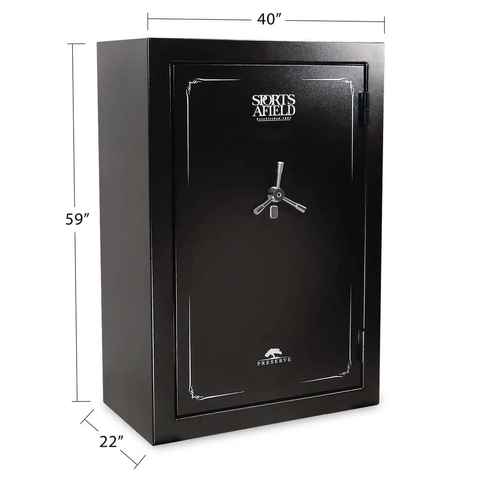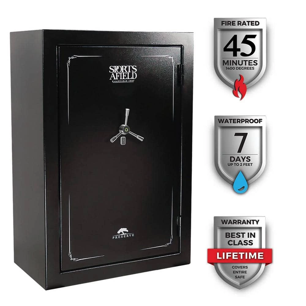 The Preserve SA5940P-BIO 20.55 cu. ft. Fireproof and Waterproof 40-Gun Safe with Biometric Lock provides all the essentials for security, giving you total peace of mind. Our proprietary Triple Seal technology creates a seal against fire, water, and smoke damage. The Preserve long gun safe is constructed out of industrial-grade steel with a fortified Uni-Weld body and eight 1.5 in. steel locking bolts. The illuminated biometric lock is programmable for up to 100 unique fingerprints and includes two Fail Safe override keys for backup entry. The interior of the safe is fully carpeted and includes a carpeted barrel rest with 40 gun positions, a Zero-Sag steel reinforced top shelf, and three height-adjustable/removable side shelves. This gun safe is California DOJ approved and includes our best-in-class Lifetime Warranty that covers the entire safe against theft, fire, natural flood, locks, parts, and paint.