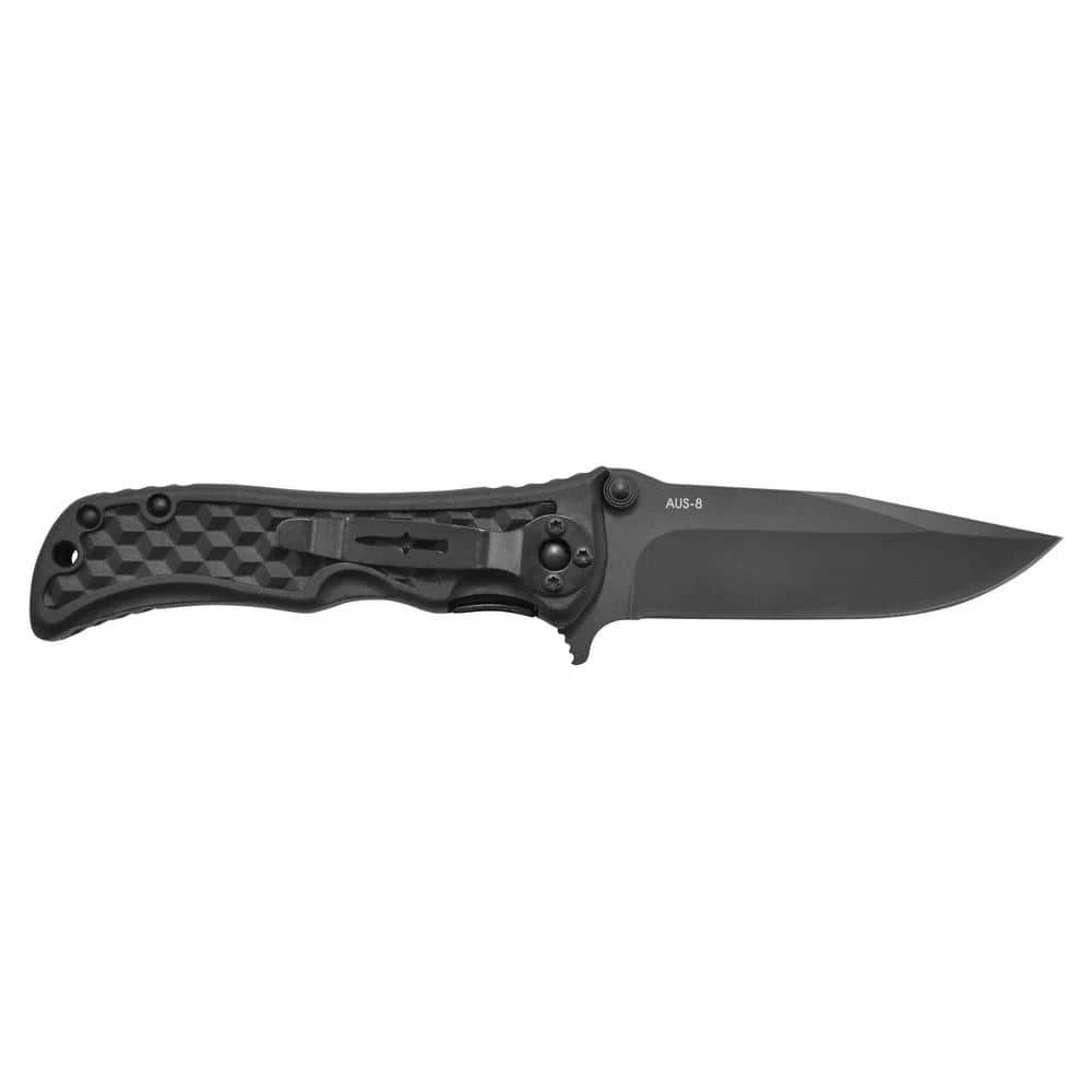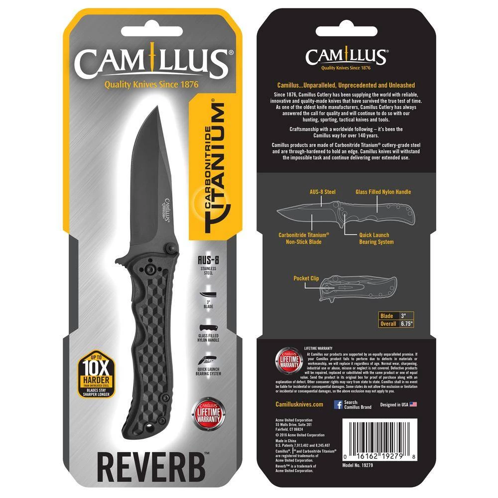 Camillus Reverb 6.75 in. Folding Knife with a blackout look and feel, the Reverb features a 3 in. AUS-8, Carbonitride Titanium blade, which is up to 10-times harder than untreated steel. AUS-8 offers exceptional balance between toughness, edge sharpness and corrosion resistance. The Reverb features a finger flipper opener that is both smooth and fast thanks to our quick launch bearing system. Lifetime Warranty.
