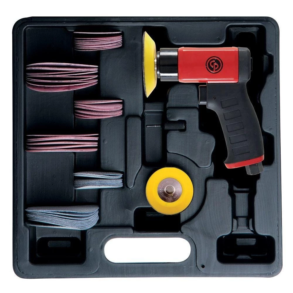 Kit includes mini random orbital sander, (1) 2 in. and 3 in. backing pads, (10) 2 in. 320, 400 and 600-Grit sand paper, (10) 3 in. 320, 400 and 600-Grit sand paper and spindle key packed in a heavy duty carrying case. Free speed: 15,000 RPM; average air consumption: 10.5 cfm; air inlet thread: 1/4 in. NPTF; minimum hose size: 3/8 in.; sound dBA: 86; weight: 1.5 lbs.