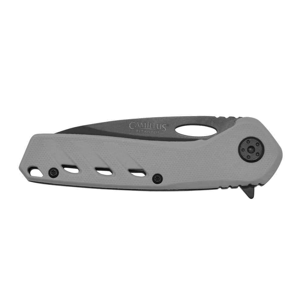 Camillus Slot Carbonitride Titanium Folding knife in gray features a 2.75 in. blade, with AUS-8 Stainless Steel and a glass-filled nylon handle. Carbonitride Titanium proprietary surface treatment offers enhanced edge retention, better protection from corrosion, chipping or flaking and is 10X stronger than untreated steel. The 4 in. glass-filled handle is very strong and rigid. Slot offers a Dual Stainless Steel Bearing System for smooth 1-hand deployment with the flipper or thumb hole. Inherent in every Camillus product is its more than 140-year commitment to craftsmanship and care, supported with a lifetime warranty.