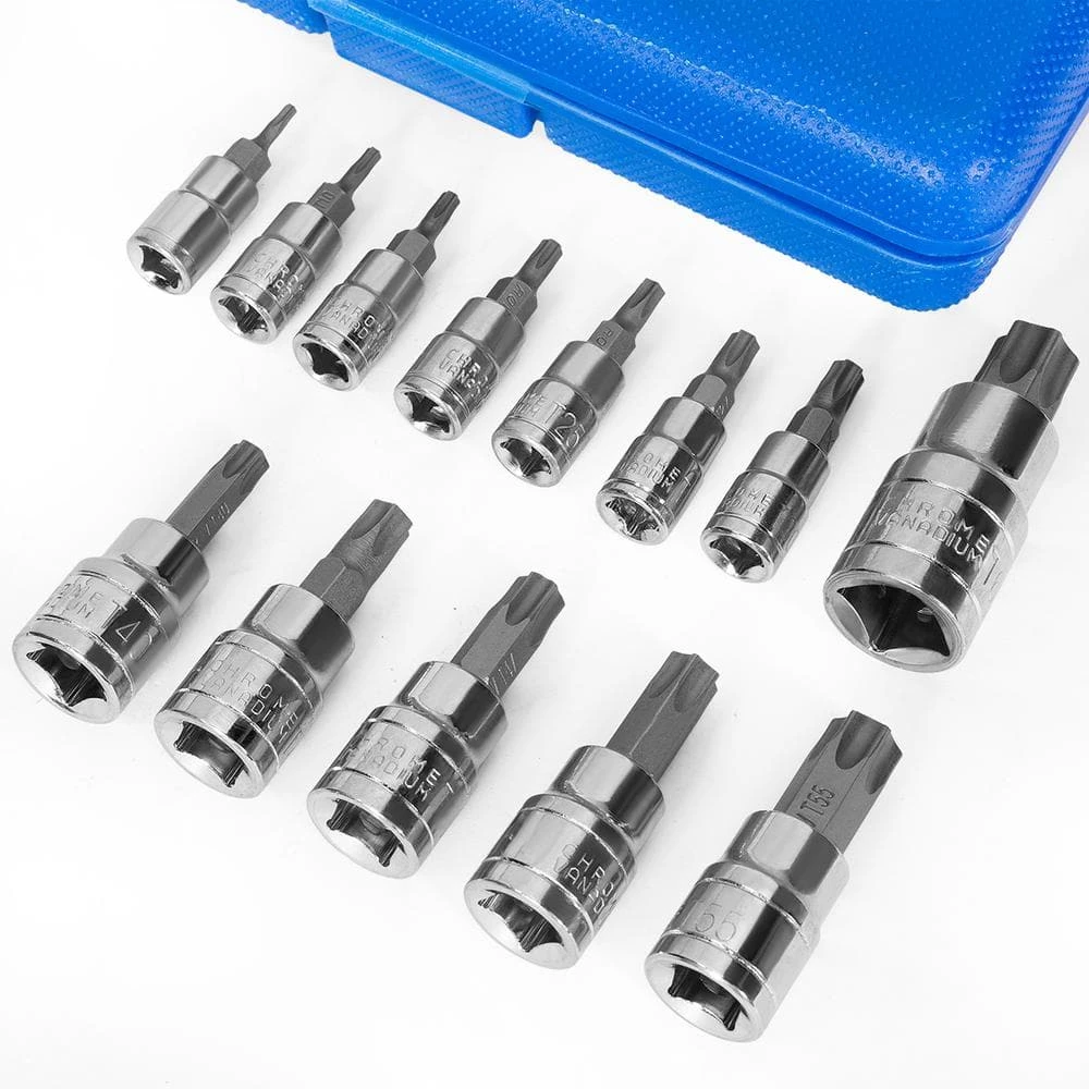 - Set includes a collection of the 13 most commonly used Torx socket bits: 1/4 in. drive (37 mm L) T8, T10, T15, T20, T25, T27, T30, 3/8 in. drive (48 mm L) T40, T45, T47, T55, 1/2 in. drive (55 mm L) T60